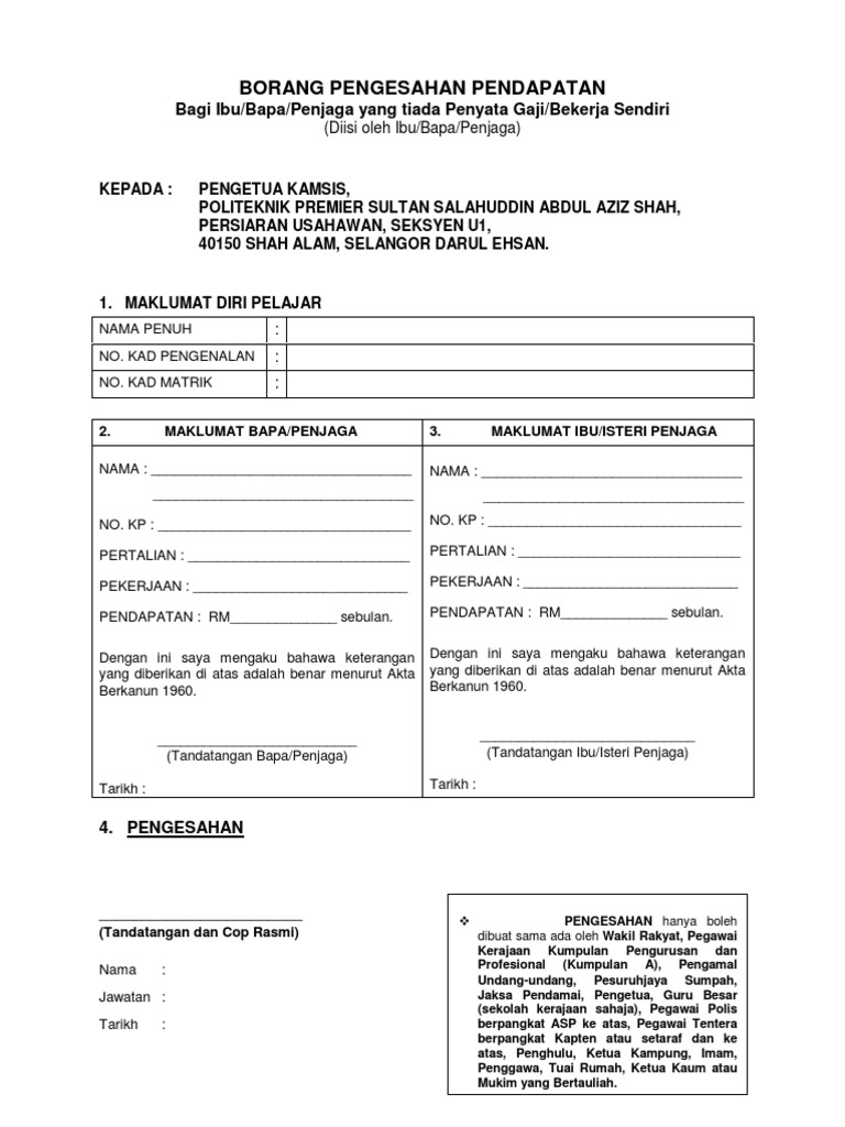 BORANG PENGESAHAN PENDAPATAN Bagi IbuBapaPenjaga yang tiada Penyata GajiBekerja Sendiri Diisi oleh IbuBapaPenjaga 2. Https saffad ump edu my index php en muat turun biasiswa kebajikan 278 pengesahan pendapatan ibu bapa file. Contoh surat rasmi pengesahan pendapatan bekerja sendiri in english contoh surat rasmi pengesahan pendapatan bekerja sendiri di contoh sur.